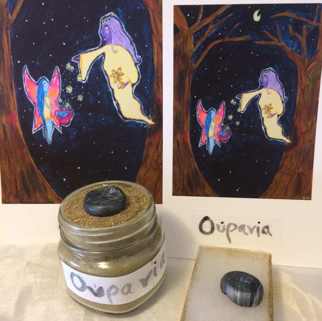 As subscribers to the Centaur Space you are getting first access to this beautiful array of devotional magic dedicated to the Muse of Astronomy and Astrology, Urania. The magical occasion happened as Okyrhoe, healing nymph of the Centaur clan, conjoined both Jupiter and asteroid Urania earlier this month. Abigail Soltis created a talismanic painting during the same window of time that I calligraphed the name of Urania in Greek (using the same charmed ink from the Neptune in Pisces series). We printed a small run of these when Jupiter and Neptune conjoined… they came out amazing, and are paired with a new Okyrhoe-Jupiter clay talisman, and Scent of the Muse (an herbal blend of Rosemary, Agrimony, St John’s Wort, and hand-picked Mugwort).
