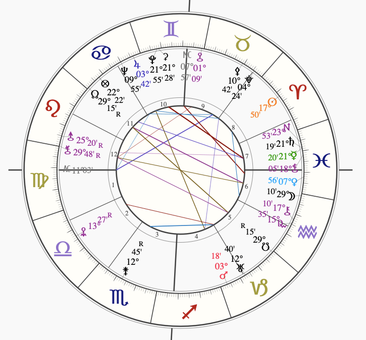 Factoring in Chariklo to her nativity, we find the Centaur Queen near the author’s Mercury-Saturn conjunction in Pisces. How fitting that she found astrology after her Chariklo return, and eased into the healing work beyond the merely academic route that her theological career veered toward (as signified by Mercury-Saturn in Pisces!). Nearby, Nessus approaches the eventual discovery degree of Okyrhoe, which implies a thirst for truth. Spiritual Jupiter-Neptune conjunct in a water sign, close to a Neptune-Uranus opposition which defined that era of revolutionary movement, (and which marks the epiphany of Rudolf Steiner, founder of what would be her chosen spiritual path at the end of her life).