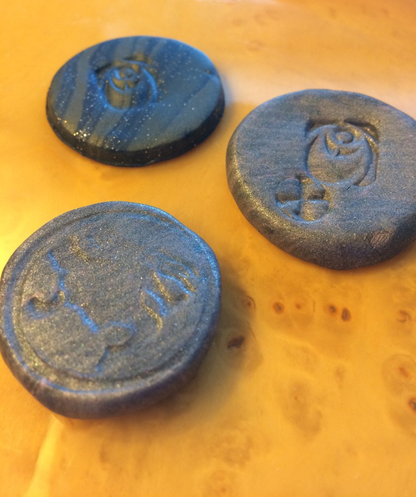 Chariklo Cazimi gems (inscribed flourite, blue lace agate, and blue kyanite) are set in clay to be worn on a necklace. This election was special, with Moon in a trine to the Cazimi (the Centaur in the heart of the Sun) from the auspicious 11th House. Better yet, the ruling planet of the first house (which symbolizes the bearer of the talisman) is an exalted Venus in Pisces, in the 5th House of love. These planets support Chariklo in her mission to send us cosmic love, which here is grounded through the Immum Coeli, the root angle of the astrology chart where we find Chariklo. A healing gem! $25 including domestic US shipping. All sold.