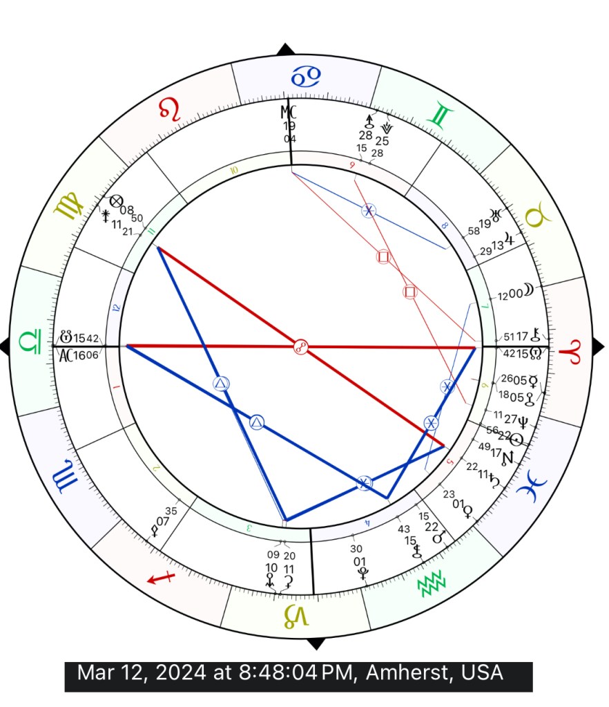 I created new copper talismans of Chiron in an astrological election that nestles Chiron’s healing power within a beautiful setting of Moon and Venus in their signs of exaltation. Copper, metal of Venus, provides an elemental affinity with the planet of grace and love. These chunky copper “coins” are double sided, with a bold front design of a Bacchante and Centaur, with a reverse featuring Chiron playing the harp. Created in an election of March 12, 2024 (8:48 PM W. Massachusetts USA) that places Chiron in the angular 7th house to focalize his wisdom and guidance. Venus, exalted in Pisces, is lord of both the Libra Ascendant and Taurus Moon, which it aspects in a harmonious sextile. Exalted Moon applies to Chiron’s discovery degree to further draw in his blessings.