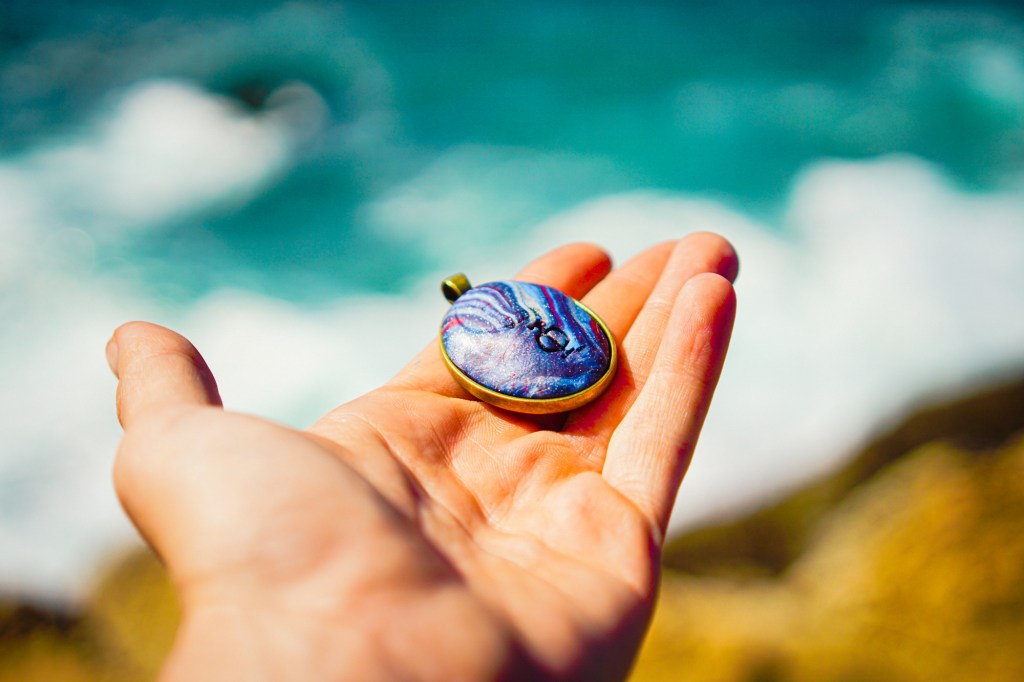 A new Pholus talismanic series is here! Concluding a process that began with the Pholus Full Moon of July 24, 2021, this series combines blueberries (harvested and decocted into wine and burned to ash) with our signature cosmic swirl of energetically empowered clay. The image is a portrait of Dionysos (Bacchus), God of Wine, who provided Centaur Pholus with the ambrosial wine that was his treasure to guard. Golden Phi letters, from the first Greek letter of Pholus’ name and also the Golden Mean), adorn the wearable pendant talismans in this series. Each pendant is set into brass, enclosing an amount of blueberry ash behind it, and anointed with a drop of dried blueberry wine.