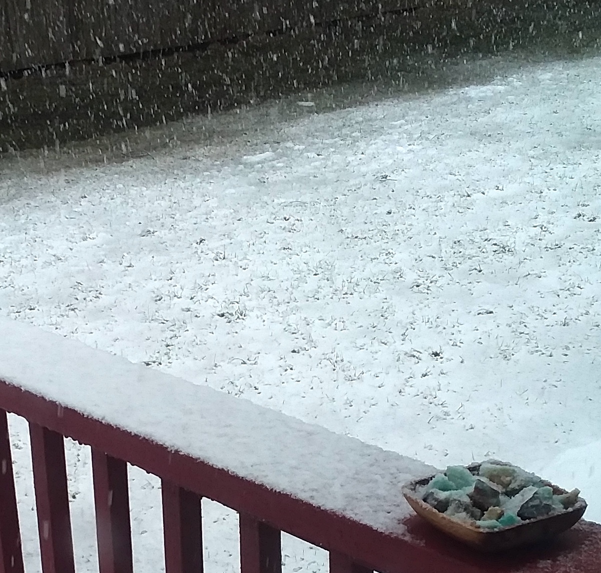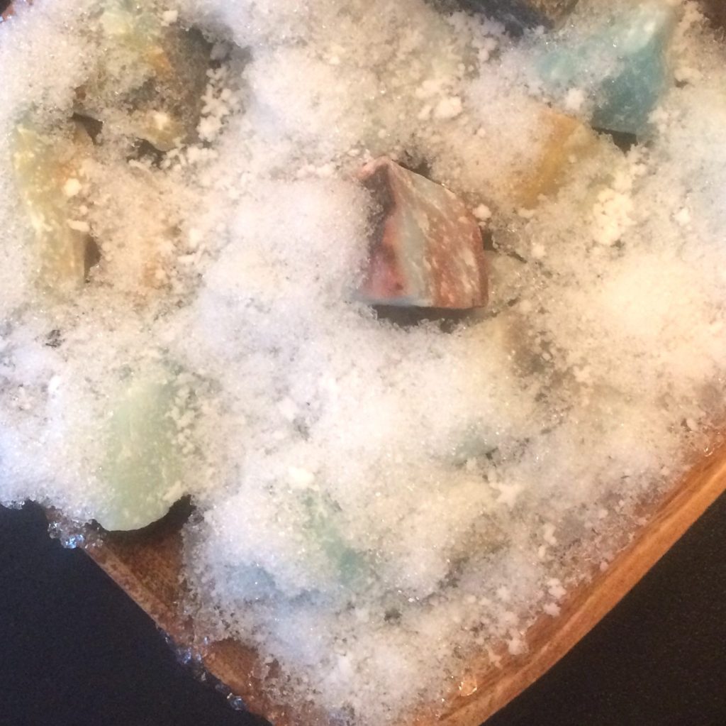 Fortuitously, in the hour of the Moon, with waxing Moon rising in Cancer, trine Jupiter, a magical snowfall happened to grace the proceedings outside – a baptismal moment for the sea-green Amazonite rocks to be offered to Neptune. Later the collected snow-melt was used to wet each piece of clay in the Mary series before making the impression of Her visitation at Lourdes.