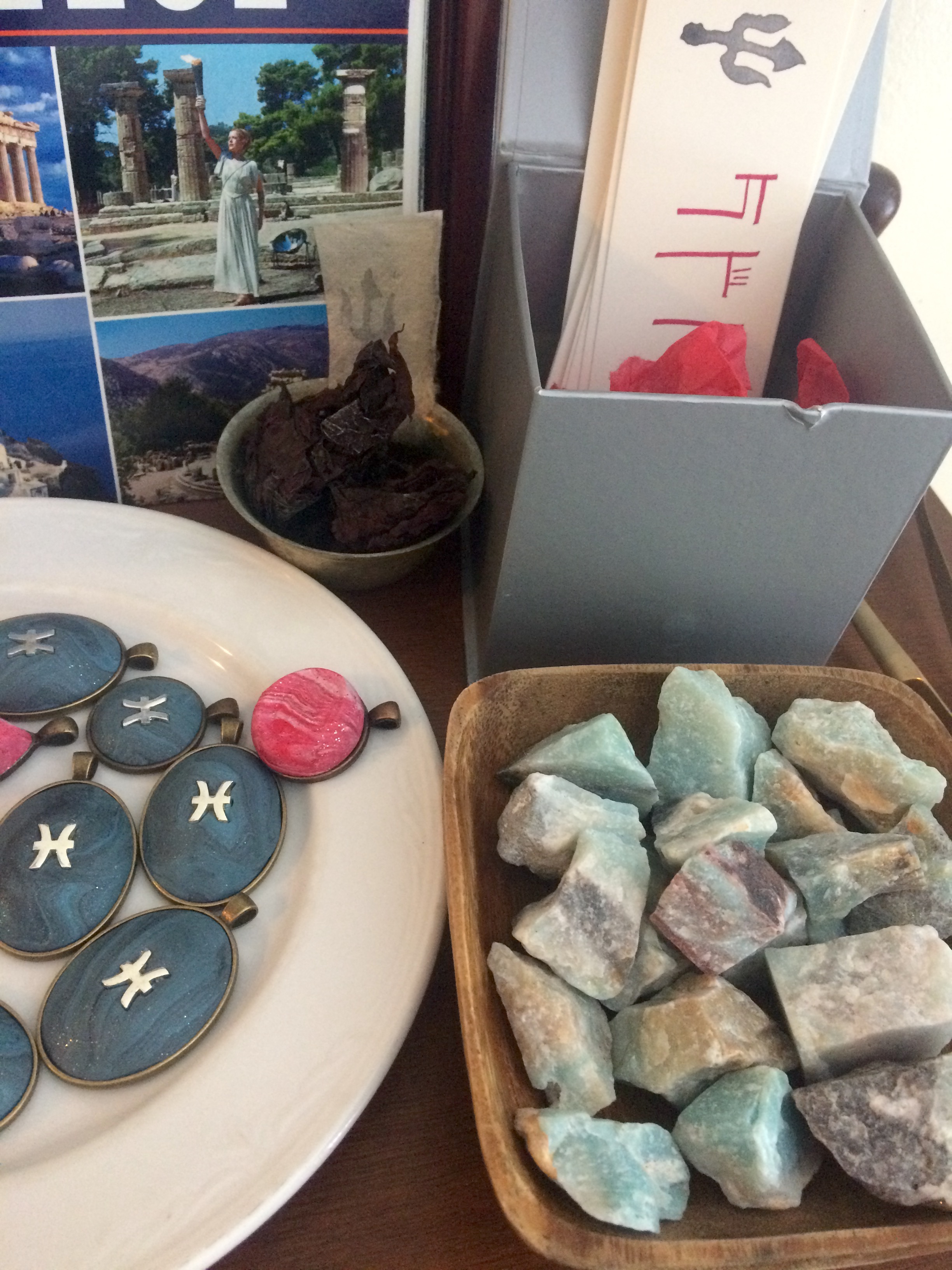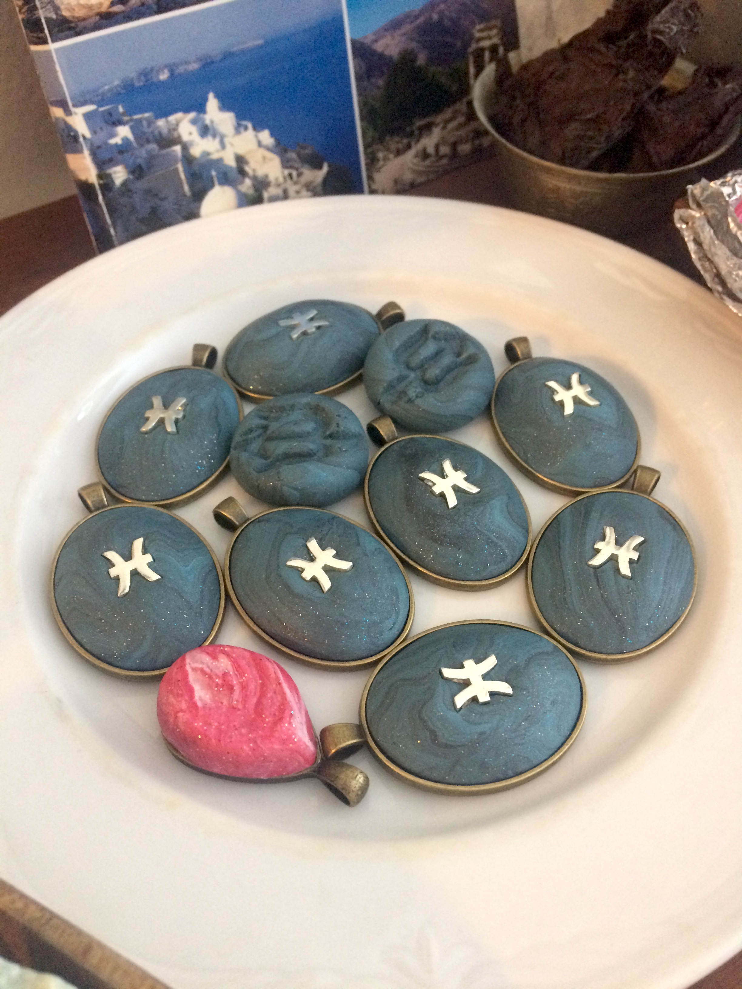 March 12 (Neptune cazimi day) also provided a classic Jupiterian election, with the Cancer Moon casting a trine on the domiciled star of Zeus. This was my opportunity to mix the stormy-sea colored clay and shape them to their pendants; the Star of Poseidon (planet Neptune) also crested the Midheaven in the course of this aspect.